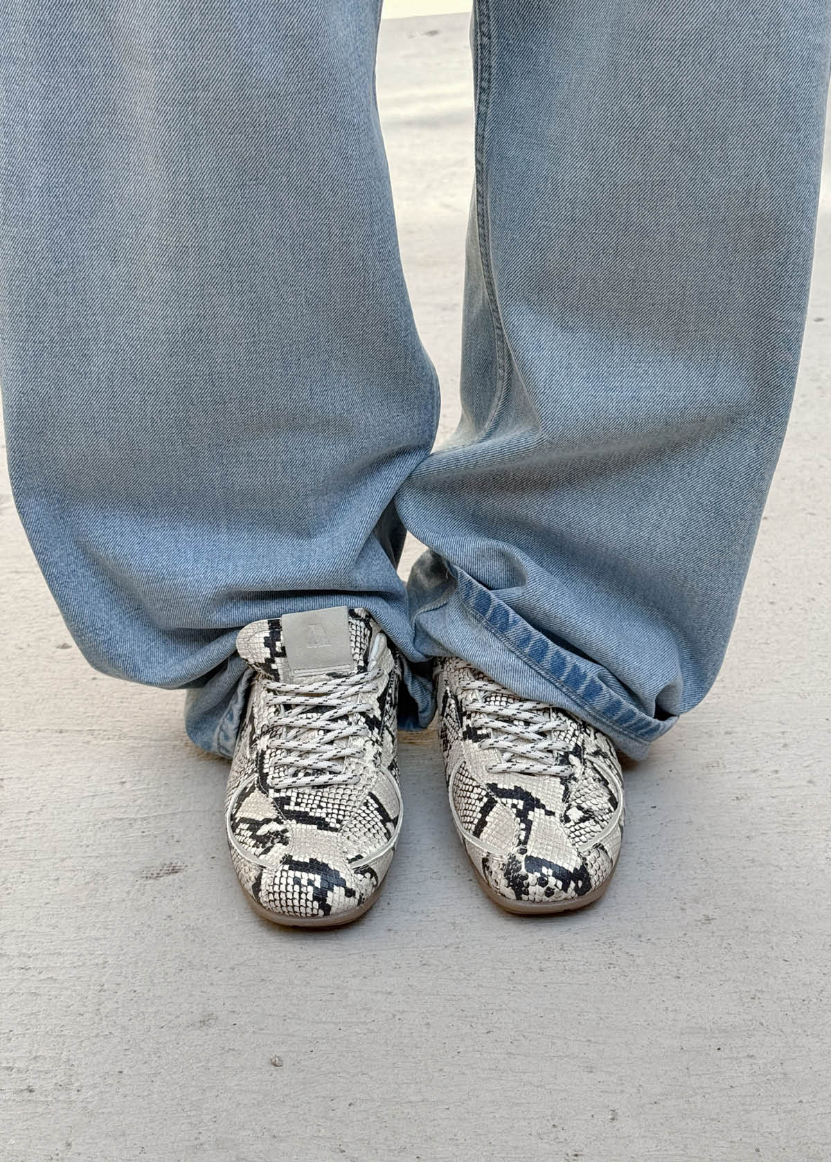 The Tb.970 sneakers revisit a retro-inspired silhouette with a refined twist. Built from layered panels of snake-print leather. they feature a lace-up front with cream laces detailed with black stripes. while slim rubber soles complete the profile with comfort and wearability.
